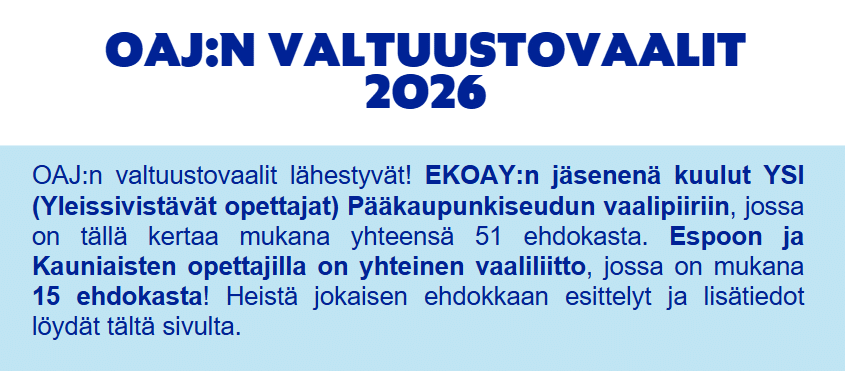 OAJ:n valtuustovaalit järjestetään nyt täysin sähköisinä ajalla 17.-30.3.2026. Valtuustovaalien aikana OAJ järjestää oman arvonnan kaikkien äänestäneiden kesken jokaisena vaalipäivänä arpomalla päivittäin 500 euron arvoisen lahjakortin siihen mennessä äänestäneiden joukosta. Kun äänestät jo ensimmäisenä päivänä, olet siis automaattisesti mukana jokaisen äänestyspäivän arvonnassa! Tämän arvonnan lisäksi myös äänestäneiden EKOAY:n jäsenten kesken arvotaan OAJ:n toimesta palkintoja.